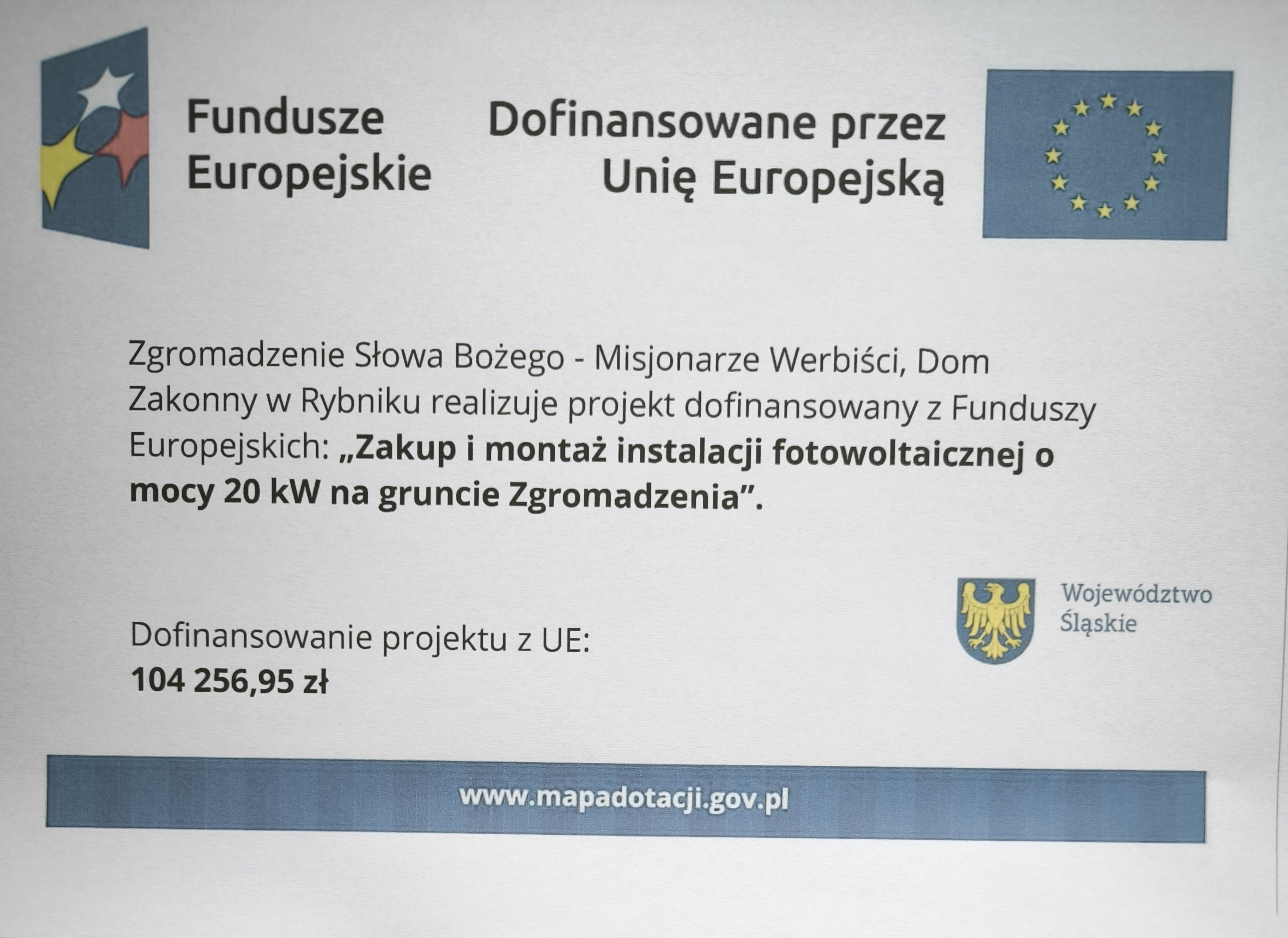 Zgromadzenie Słowa Bożego - Misjonarze Werbiści, Dom Zakonny w Rybniku realizuje projekt dofinansowany z Funduszy Europejskich: „Zakup i montaż instalacji fotowoltaicznej o mocy 20 kW na gruncie Zgromadzenia”. Projekt jest współfinansowany przez Unię Europejską ze środków Funduszu na rzecz Sprawiedliwej Transformacji w ramach programu Fundusze Europejskie dla Śląskiego 2021–2027.